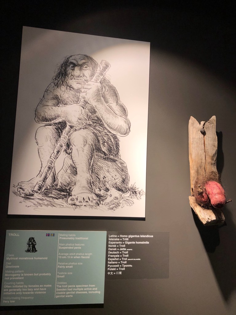 Finally it was time to visit the Icelandic Phallological Museum, better known as the penis museum. At 284 displays, it holds the Guinness world record and probably always will. All the mammals and maritime species of Iceland are represented. I must say they all looked a bit sad and lonely submerged in formaldehyde separated from their owners. Never again to rise to the occasion. However, it was an entertaining exhibit, including lots of interesting facts, carvings, utilitarian items and more celebrating the male member.